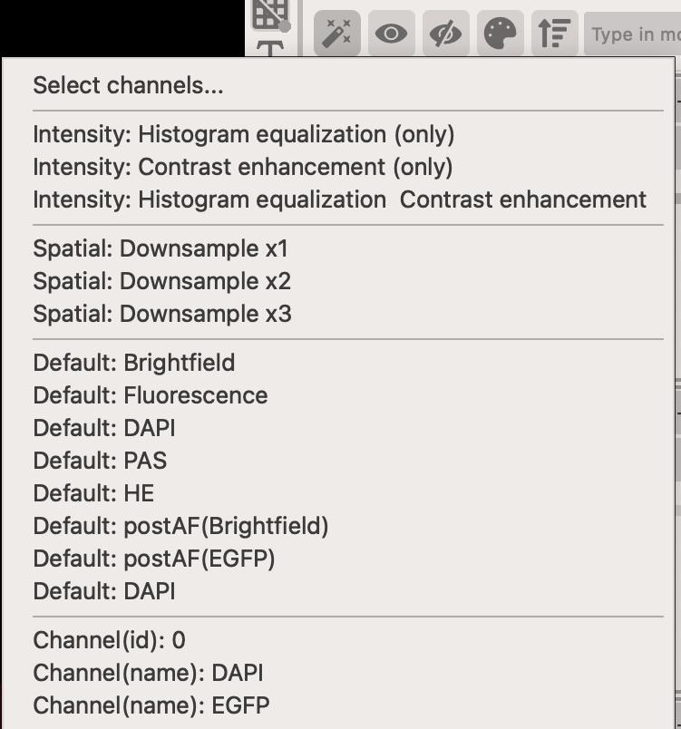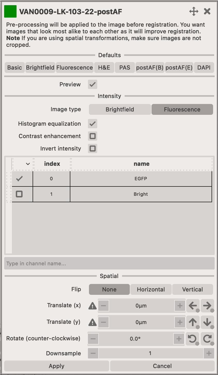 In the top-right corner of the app, you can find the list of image modalities that will be registered. You can adjust the pre-processing parameters for each modality by clicking on the widget or on the Pre-process... button.