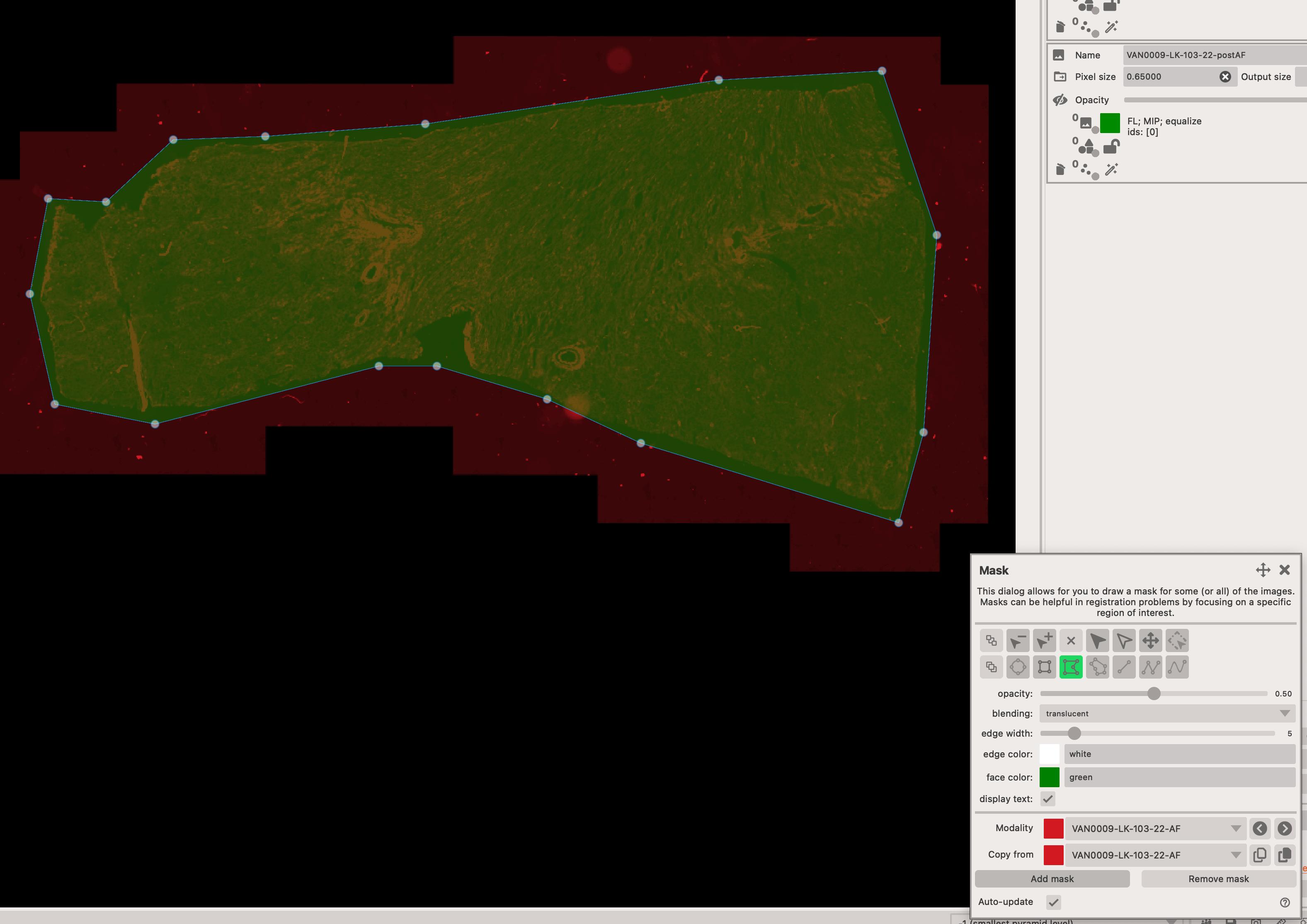 You can create masks to focus the registration on a specific part of the image. You can start this process by clicking on the Mask... button which opens a new dialog window.